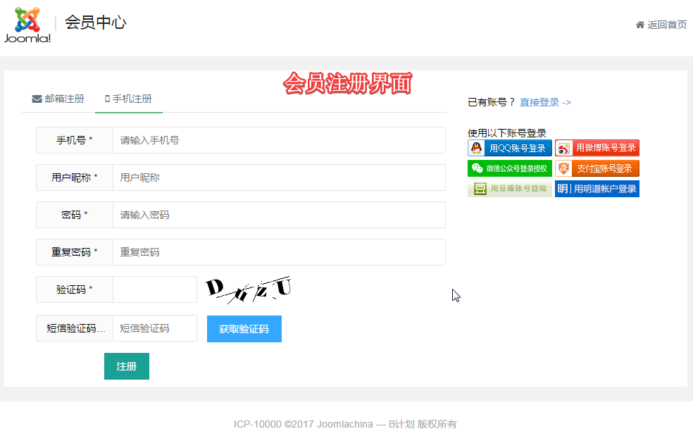 该类型将会在前台显示一个注册页面。页面效果截图如下: